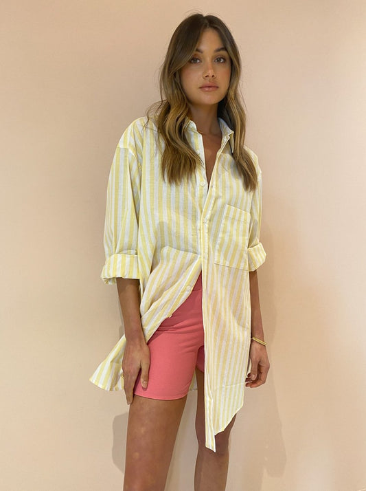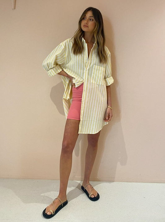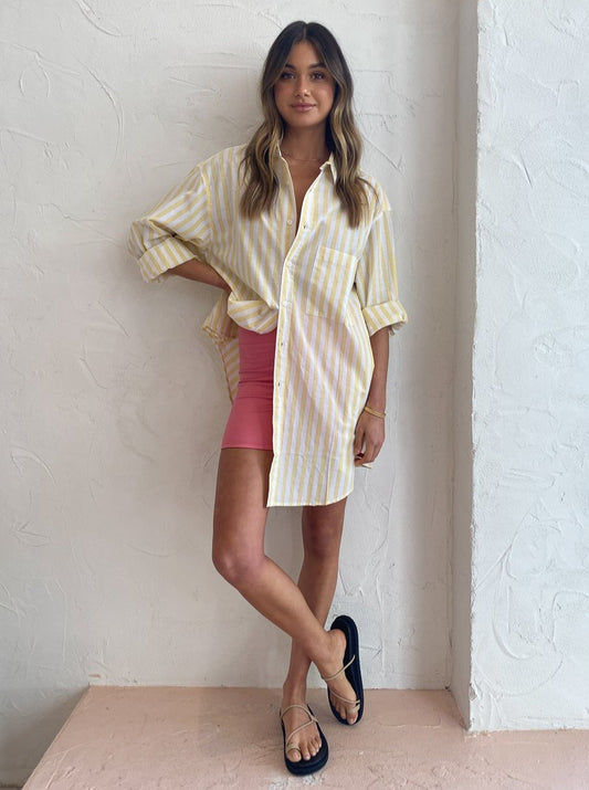 Coco Styling Tip: Complete the look with Blanca Fabienne Shirt in Yellow, Alias Mae Soji Sandal in Natural, Porter Frill Cuff and Bubble Ring in Gold.