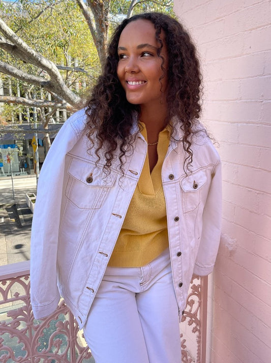 Coco Styling Tip: Complete this elegant workwear and weekend look with the matching SIR Classic Jean in Ivory and Denim Jacket in Ivory and the Alias Mae Cassie Heel in Natural.