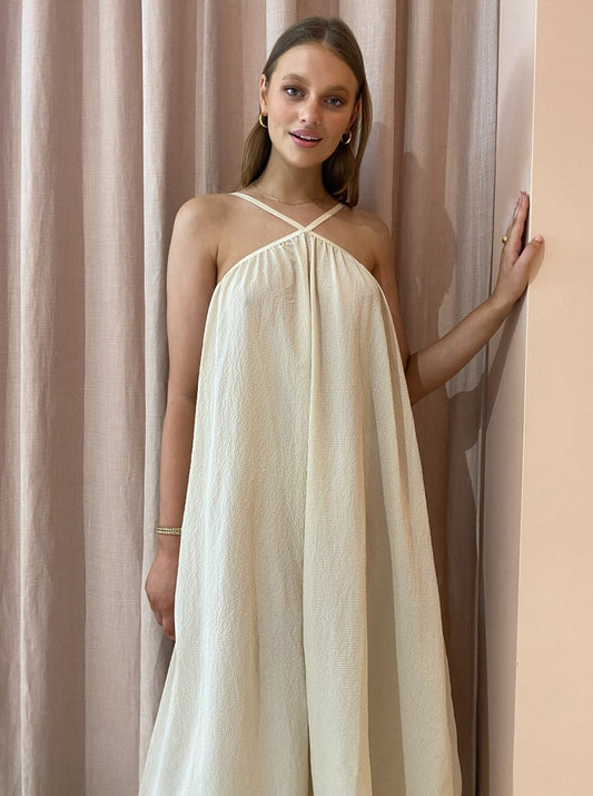 Crafted in a 100% Cotton fabrication, this sweet halter design is bra friendly and features internal side pockets.