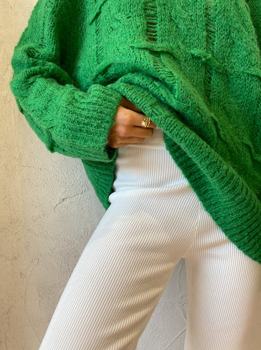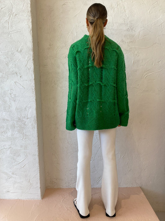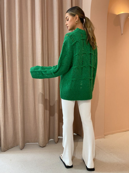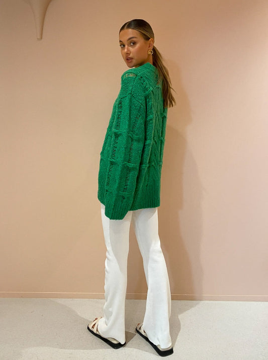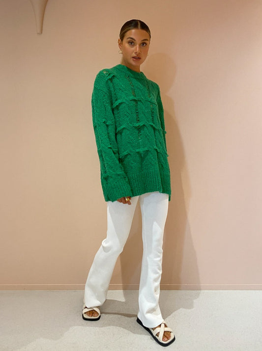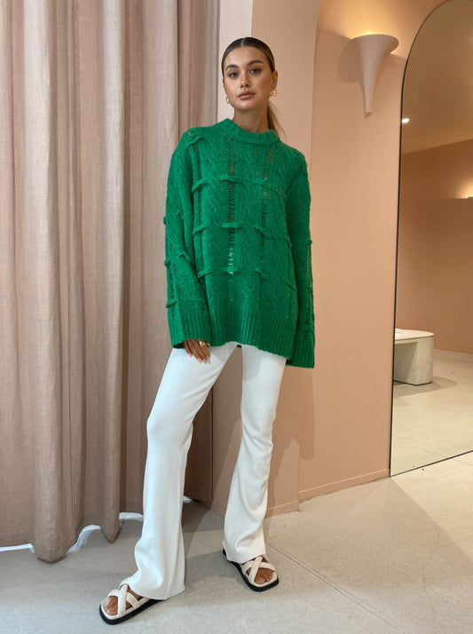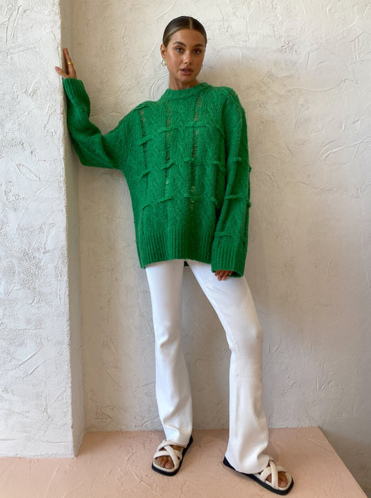 Add some colour with the Camilla & Marc Lune Cable Knit Crew in Emerald, Alohas Slip On Cross Sandal in Ivory, Porter Harp Earrings in Gold and Amber Sceats Margo Ring in Gold.