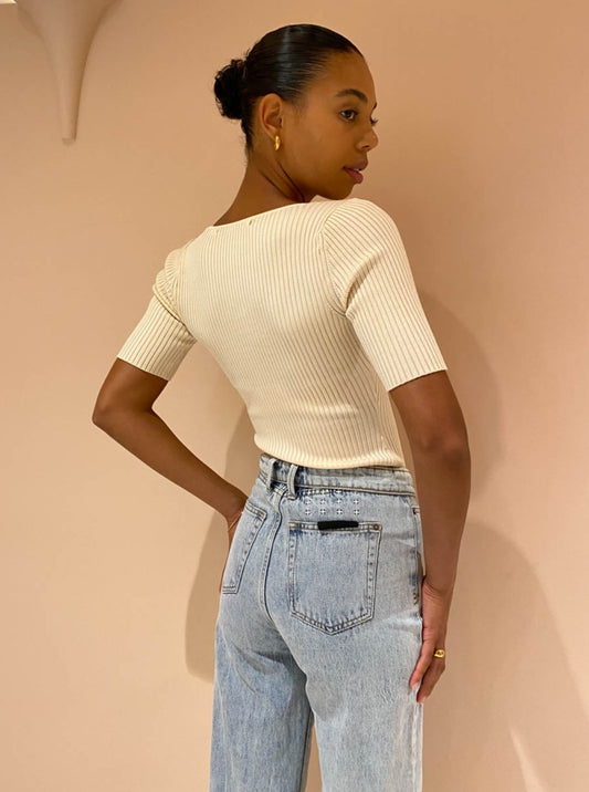 Designed to skim and contour the form, it's crafted from a mid-weight panelled rib knit fabrication in a tonal Creme hue. Featuring a soft square neckline and short sleeves.