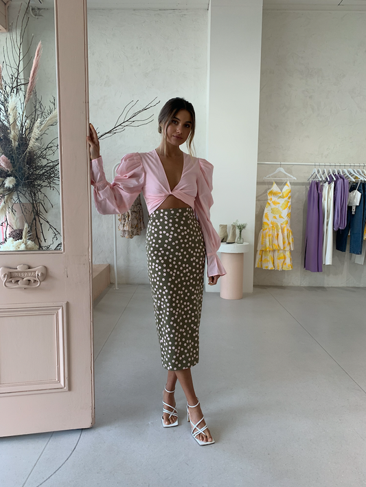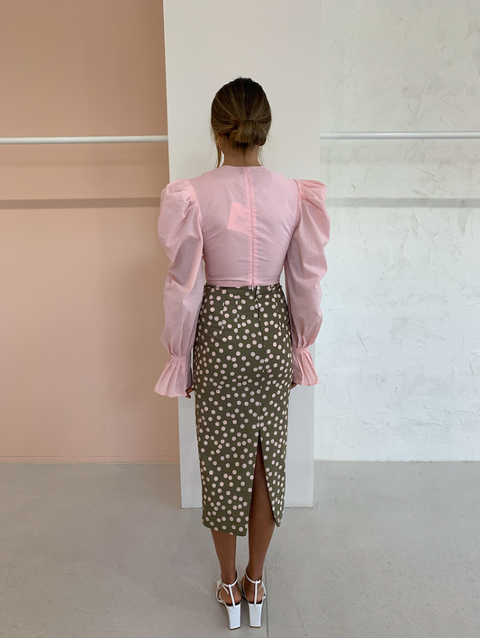 The Peach Polka Pencil skirt works for both day and night. Cut from midweight crepe, it has a high-rise, darted waist that enhances the fit through the hips and thighs. The skirt finishes on the mid calf, well below the knee for a nipped in elongated silhouette.