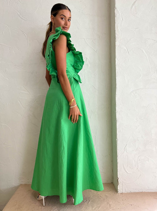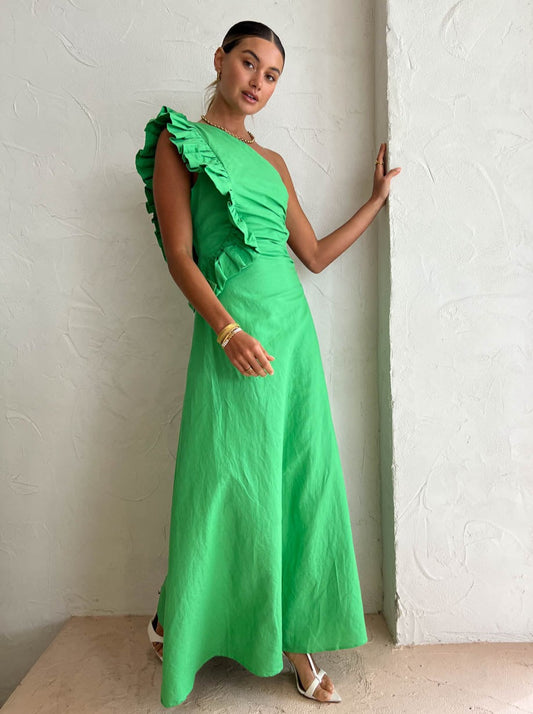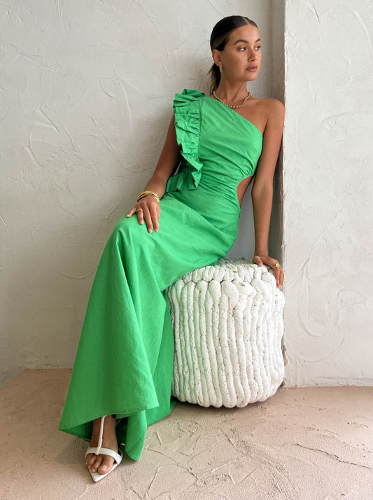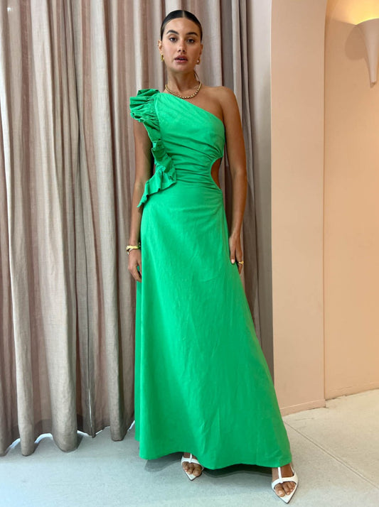 Delicately crafted from a Linen Cotton blend in Parakeet Green. This elegant one shoulder maxi dress tailors through the bodice with a waist cut out, before falling into a flowing maxi skirt.