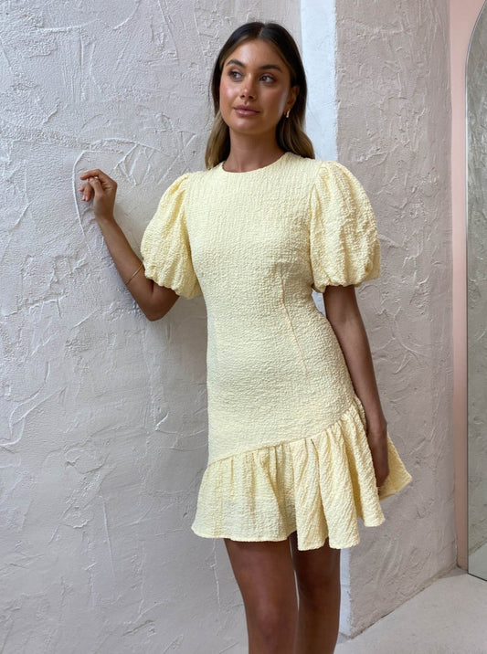 A sweet mini dress, it's crafted from a lightweight, stretchy and textured fabrication in a bright Margarita Yellow hue. Designed to flatter the femme form, the Calypso is cut with a round neckline, fitted through the body and falling into an asymmetrical frill hem.
