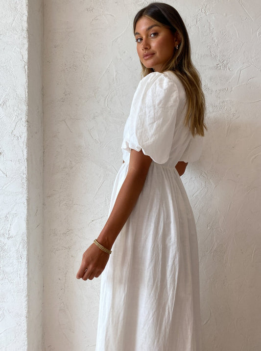 Designed for sun-kissed days, this soft maxi silhouette is crafted from a Linen Cotton Blend. Fully lined and bra friendly, it's cut with a round neckline and exaggerated billow bubble sleeves. Falling into a gently gathered maxi skirt from the fitted partial elasticated front waistline, it features pockets at the side seam and an invisible YKK zip at centre back.