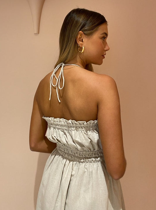 Featuring and encased gathered neckline and adjustable neck ties, we love how versatile this new addtion from By Nicola is. Style it as a halter or as a classic strapless silhouette.