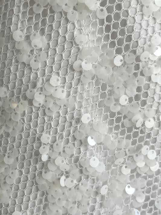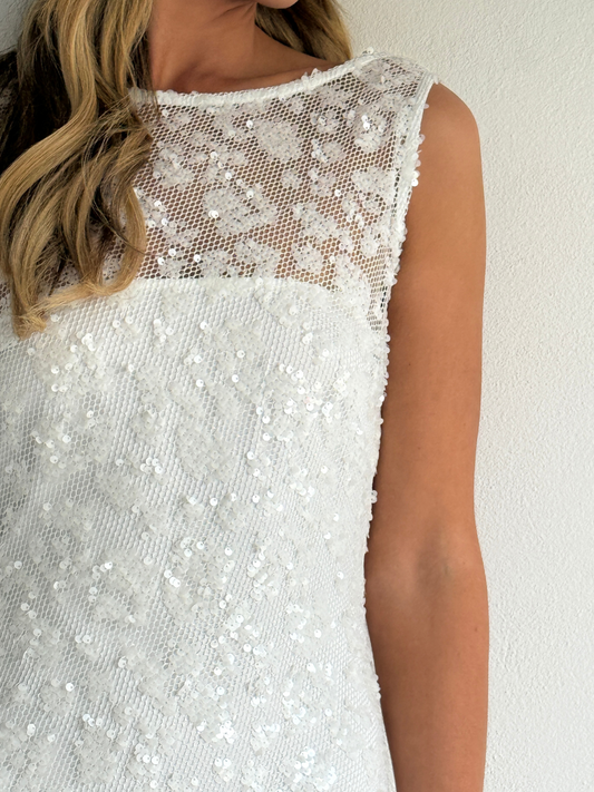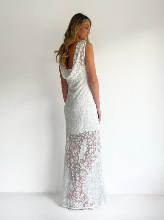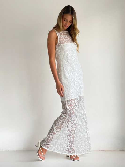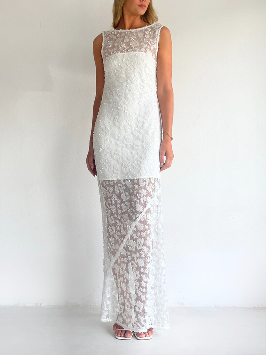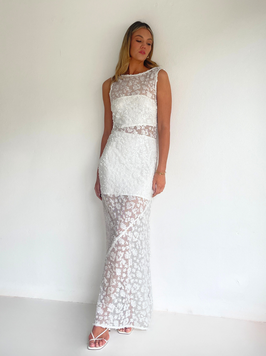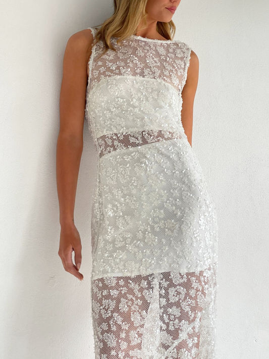The Juno Maxi Dress in Ivory is made from a delicate sequin mesh.