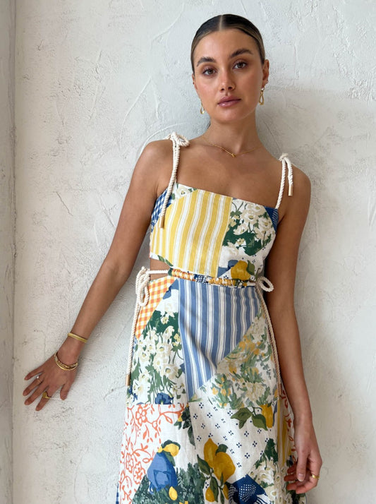 Falling softly to the floor, its Lemon Patchwork print is a conversation starter that will have everybody talking at your upcoming garden party, wedding recovery and long lunch occasion.