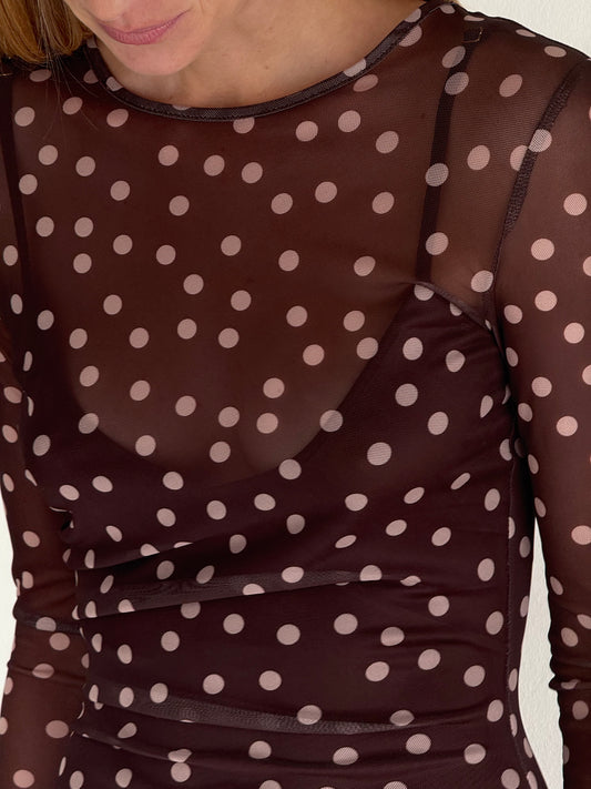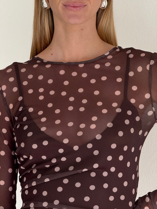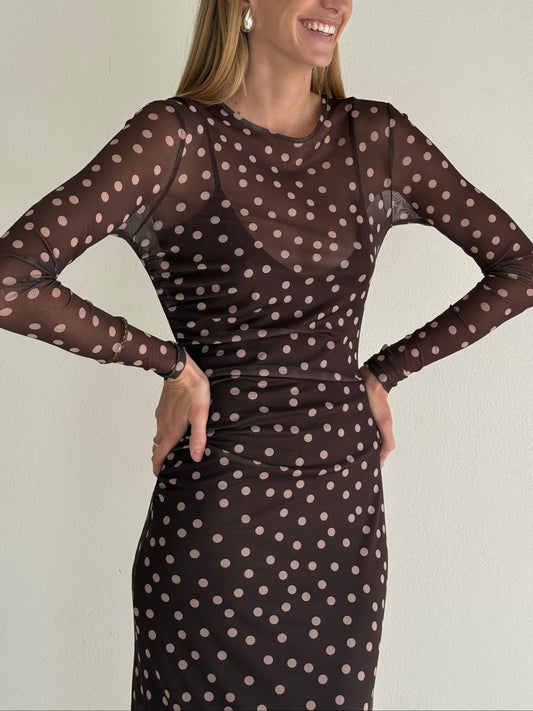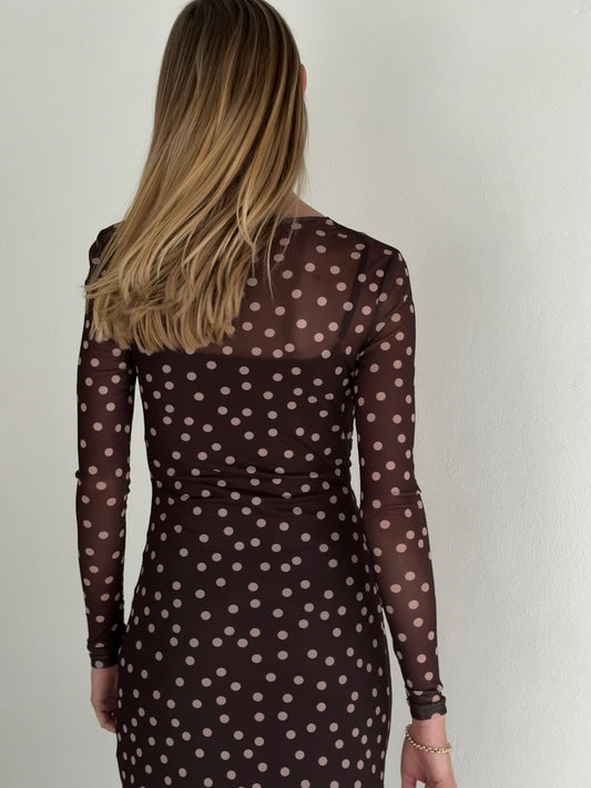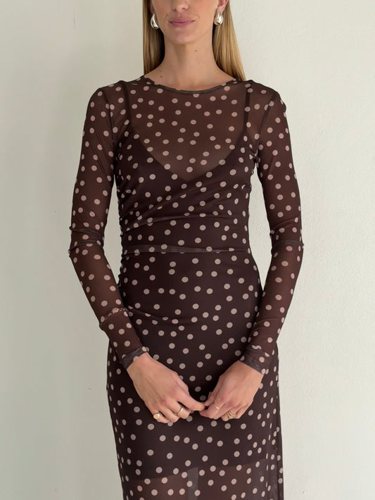 Sleek, sheer, and effortlessly striking, the Luca Maxi Dress in Chocolate Polka by By Nicola is a modern take on classic elegance. Designed in a rich chocolate brown mesh adorned with soft white polka dots, this body-hugging silhouette is perfect for day-to-night styling.