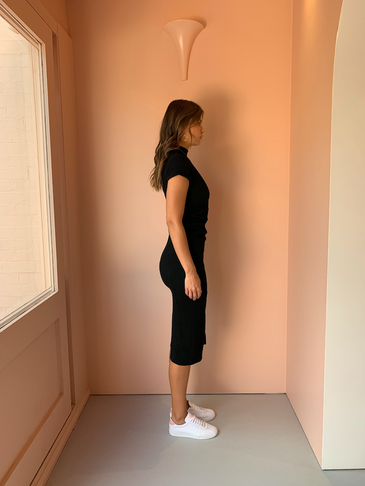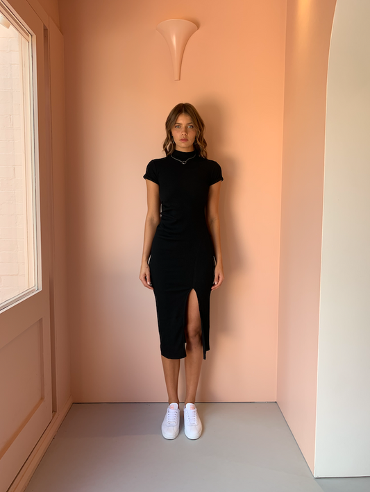 The By Nicola 'Milly' ribbed midi dress is a high neck midi with side split and cap sleeves. An easy to wear everyday essential, wear with our Coco x Superga sneakers for a luxe look and layer with your favourite jacket.