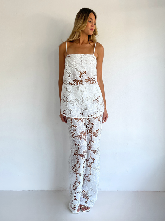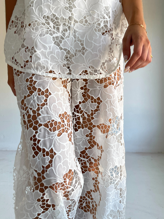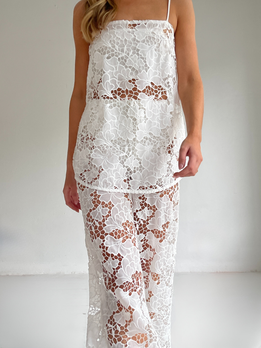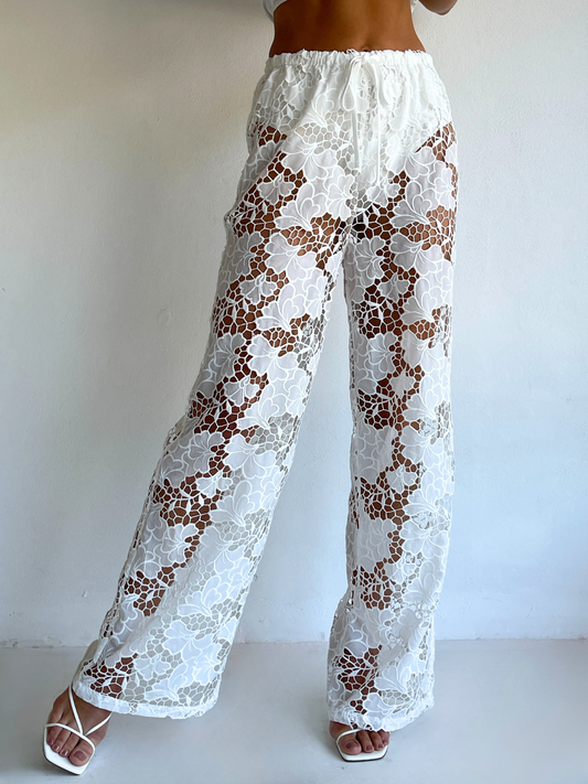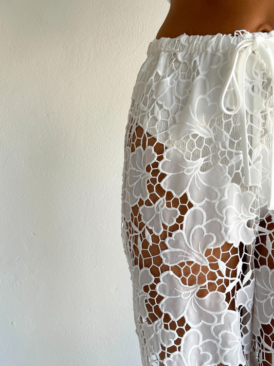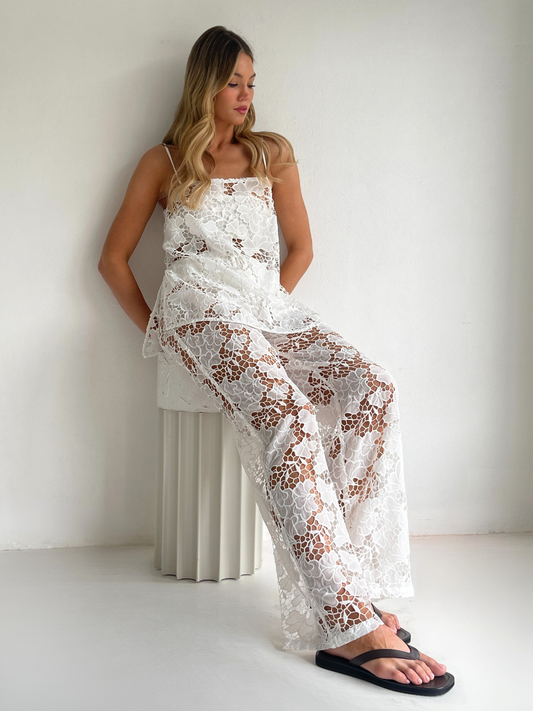 The Romily Pant from By Nicola is made from a white floral embroidered lace. Featuring an elasticised waist, relaxed fit through the leg, these wide leg pants feature bias bond seams throughout.