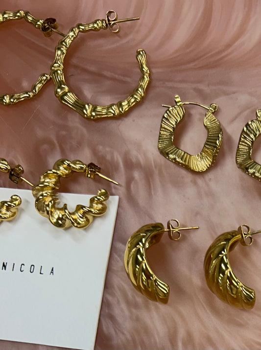 The Sophie Earrings from By Nicola are made from stainless steel and 18k gold plated. Waterproof, tarnish resistant and come packaged in a small gift pouch.