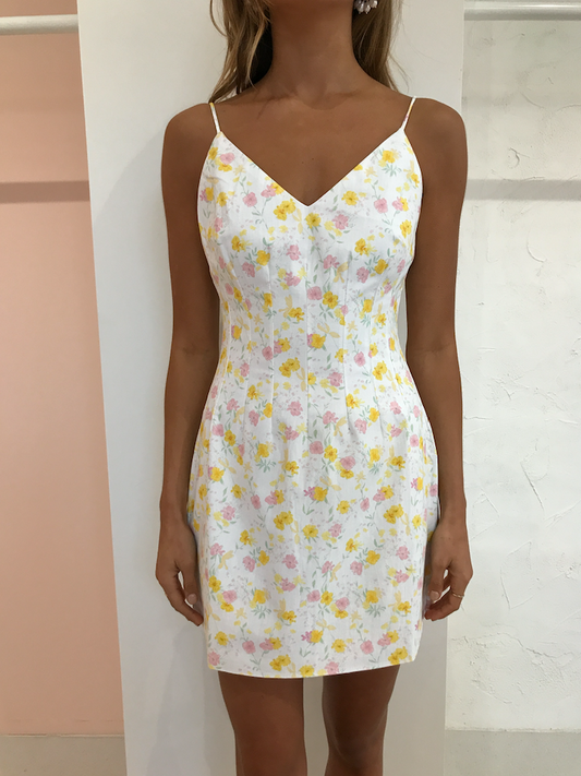 The exclusive By Nicola Wonderland mini dress is crafted from 100% cotton and features a 'Golden Blooms' print in a swirl of sorbet hues.