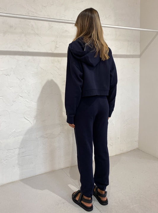 Coco Styling Tip: Wear on repeat with the Camilla and Marc Jordan Logo Hoodie in French Navy and the Camilla and Marc Fussbett Sandal in Black for an effortlessly athleisure chic co-ord weekend look.