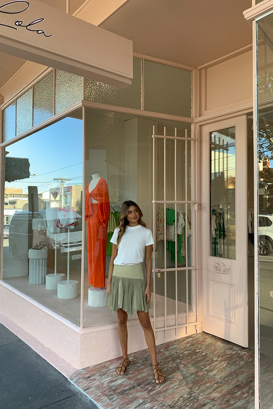 The Mason Skirt in Khaki by Camilla and Marc is a pleated summer skirt designed in a lightweight gingham print. Keep this look simple and pair with a white tee and some summer accessories.