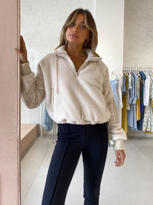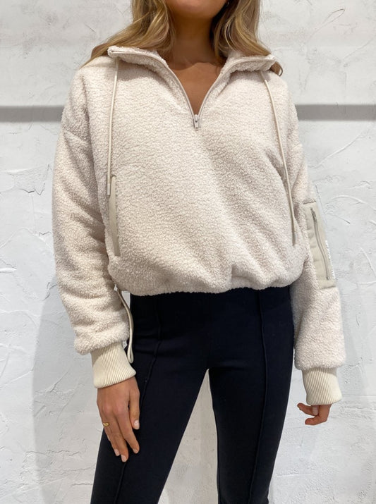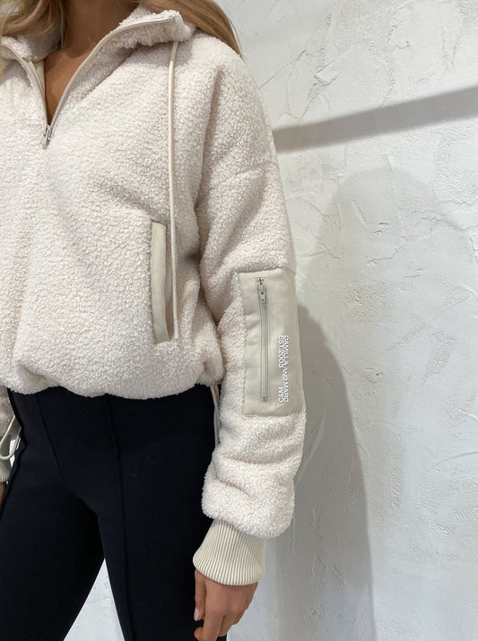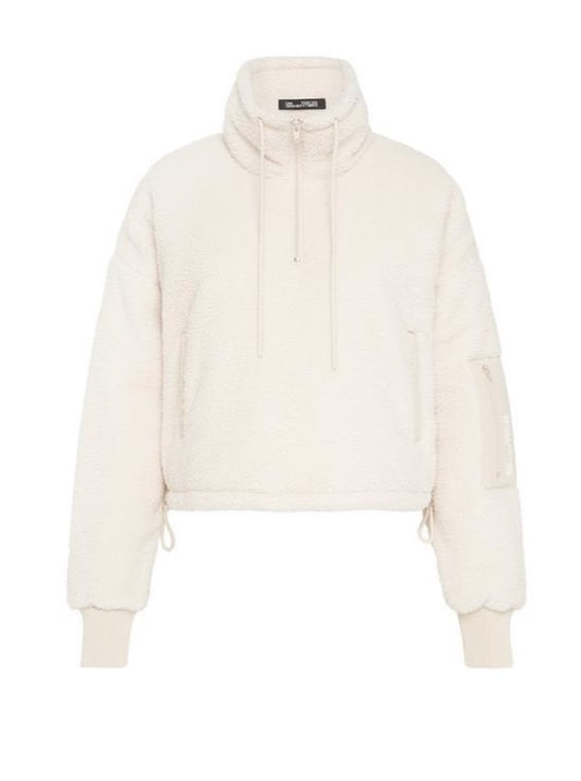 Cut from a soft and cosy faux shearling and designed for a relaxed and comfortable fit, this slightly cropped length pullover with high neck and half zip opening adds chic athleisure comfort to your off-duty styling.