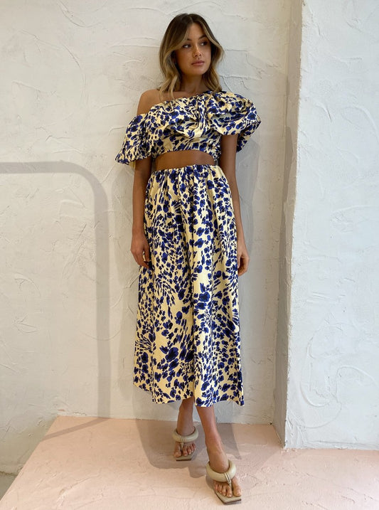 The Nadine Printed Skirt from Camilla and Marc will infuse your Coco closet with soft peachy hues and dark navy blues for endless day to night occasions.