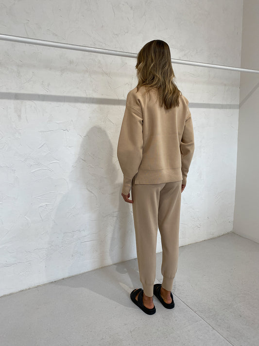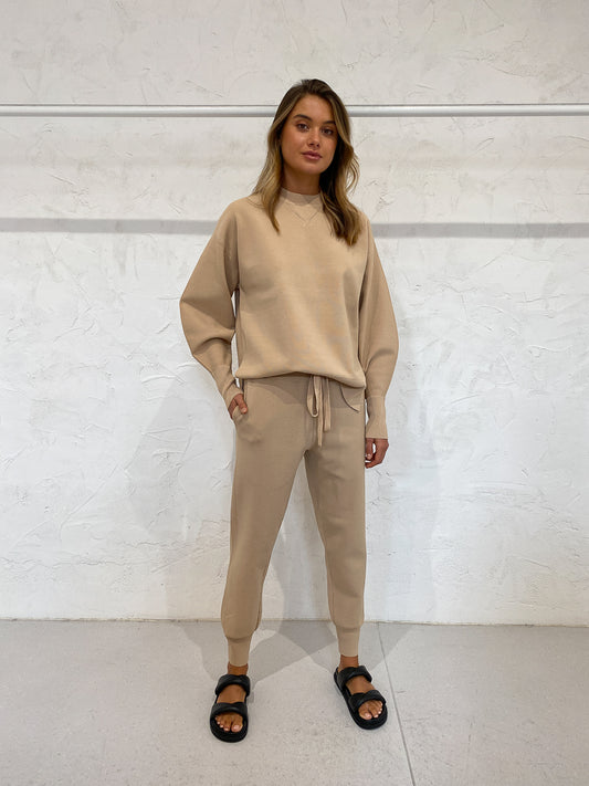 Crafted from a warming viscose/ nylon blend knit in a tonal tan, these relaxed fit pants with tapered cuffs are perfect for any active-to-out Coco occasion.