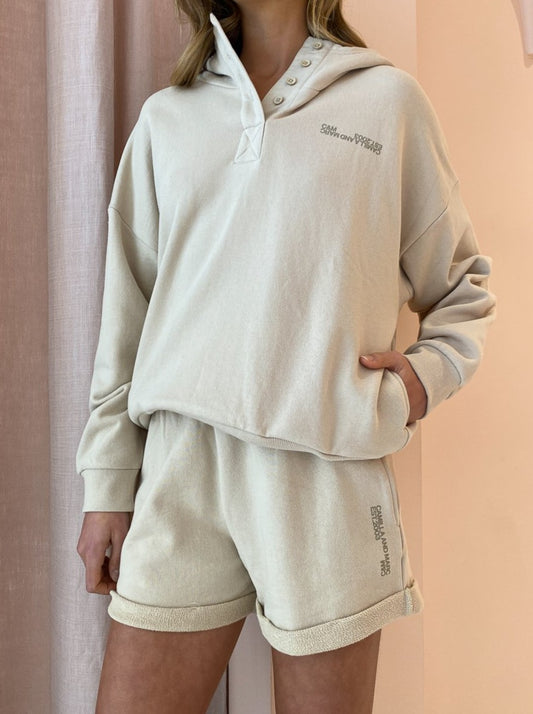 Sitting comfortably high on the waist with an enclosed elasticated gathered waistband, the Sofia Short are crafted from a lightweight and breathable loop back cotton terry fabrication in a tonal Latte hue.