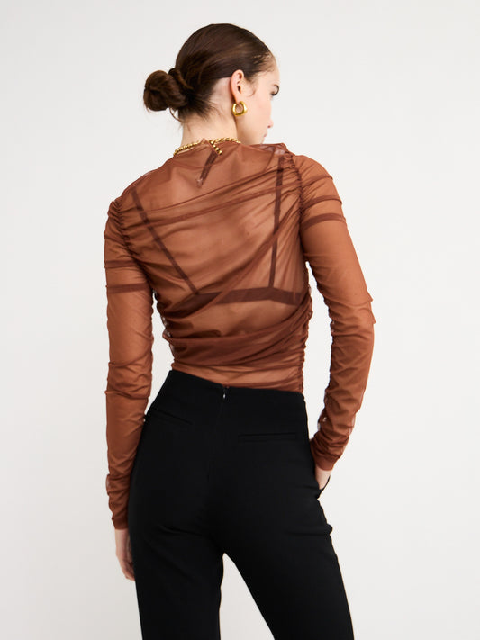 Crafted from a delicate lightweight fabrication, this flattering gathered design features long sleeves and a raw cut neckline and hem in a sheer finish.