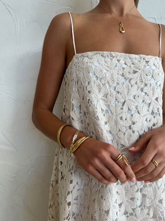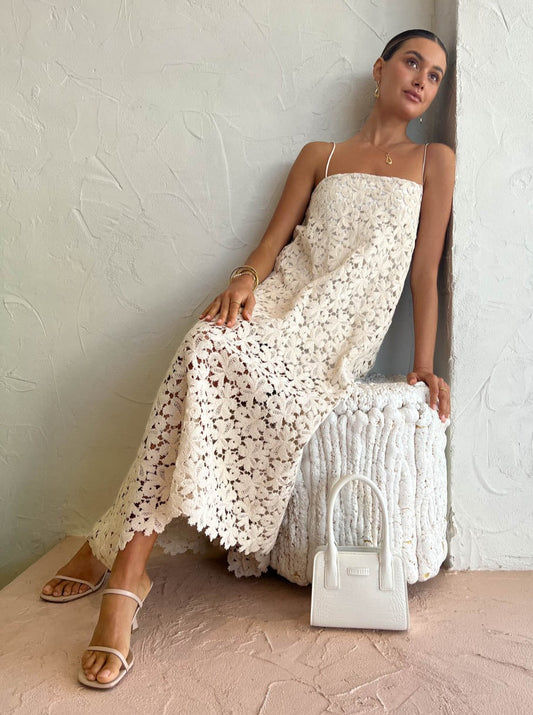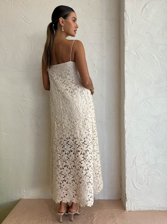 Crafted from 100% Cotton intricate cord lace, this maxi dress features subtle handkerchief hemline and fine straps.