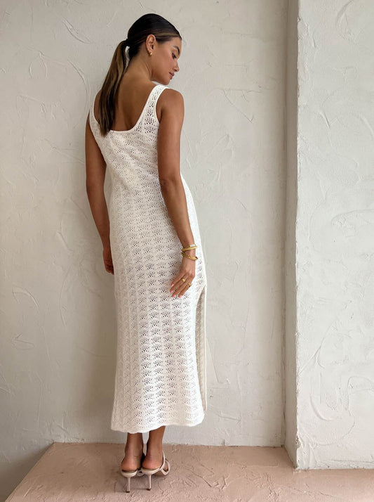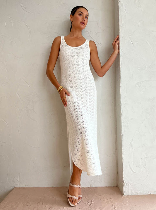 Crafted from a Linen Cotton blend that has been knitted in an intricate stitch to create an all over texture and sheer appearance, this slimline maxi dress features a flattering round neckline and high side splits.