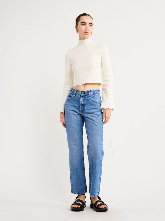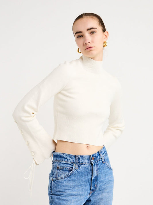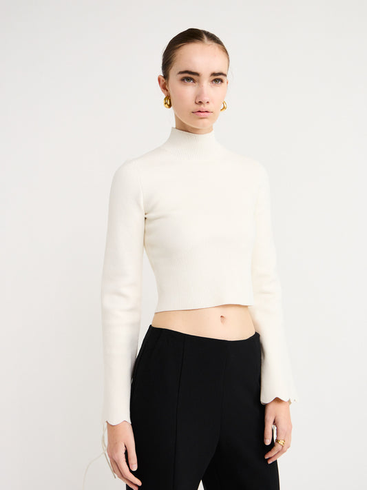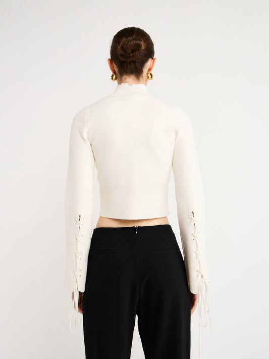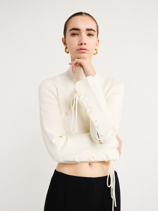 Crafted from a cotton wool blend, this top features a a subtle flare sleeve, feminine scallop edge. An intricate lace-up detail with eyelets adds an exclusive, elegant touch, perfect for any refined wardrobe.