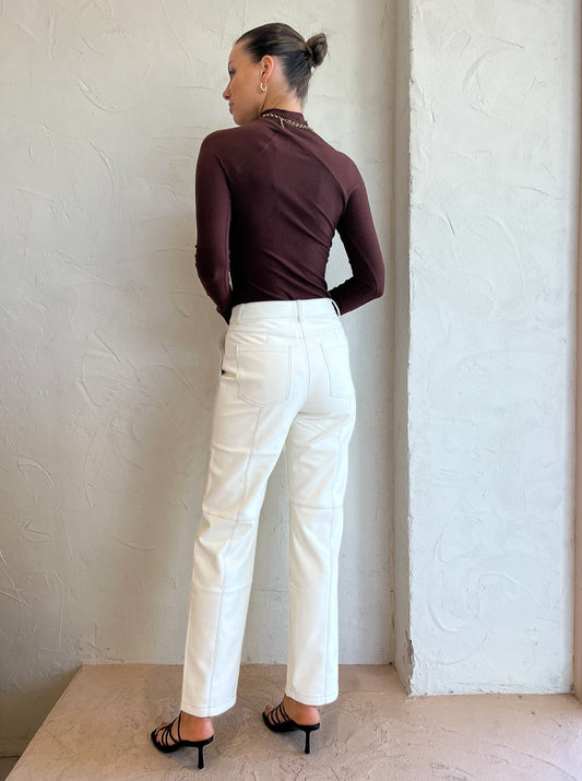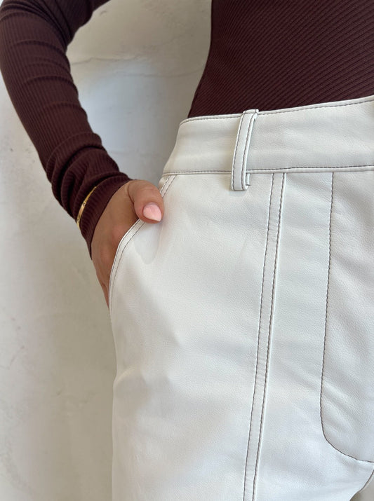 Crafted from a signature vegan leather that is buttery soft to touch. This high-waisted, relaxed-fit pant features contrast seam details, lining, and slant front patch pockets.
