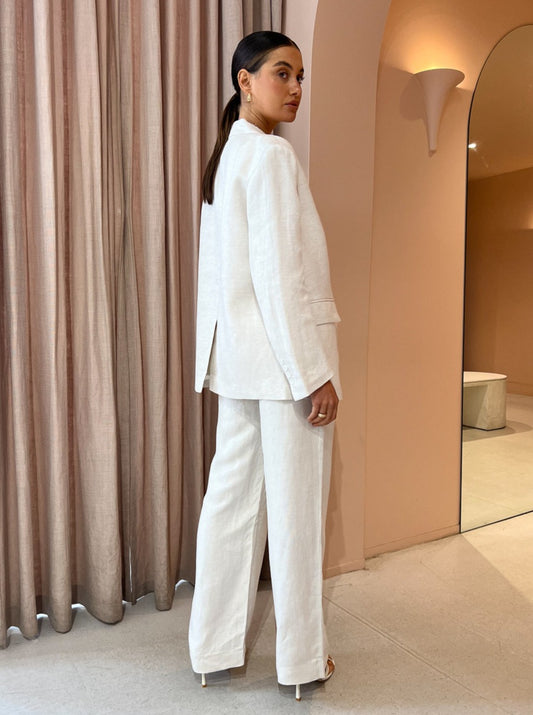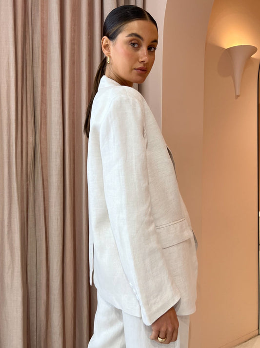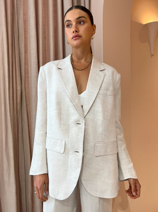 Crafted from a natural linen blend, this relaxed blazer features softly padded shoulders, classic blazer pockets and dual button fastening.