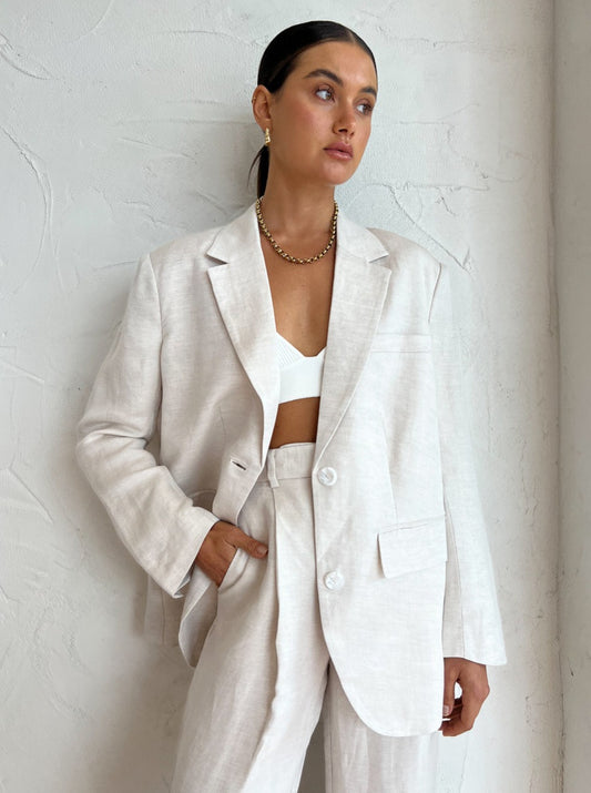 Blending relaxed tailoring with functional designs, the Martina Blazer is a timeless investment to be styled on its own or layered with the Martina Pant in natural for your work to weekend ensembles.