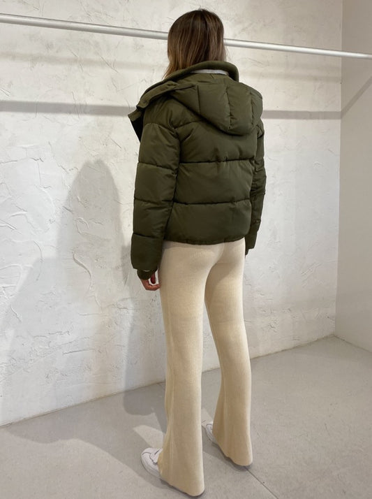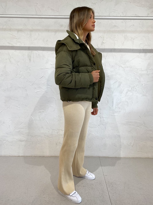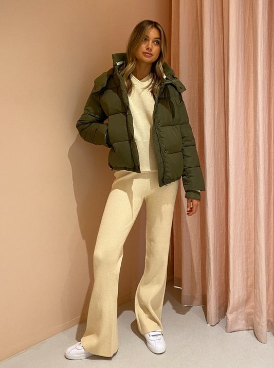 Coco Styling Tip: Layer the Cropped Puffer Jacket over the Ena Pelly Flair Knit pants in Snow and the Knitted hoodie in Snow for a luxe getaway look!