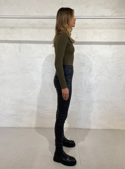 Coco Styling Tip: Elevate your winter getaway wardrobe, pairing the Leather Leggings with the EXCLUSIVE By Nicola Bella L/S High Neck Top in Khaki and the Alias Mae Cam Boots in Black Leather