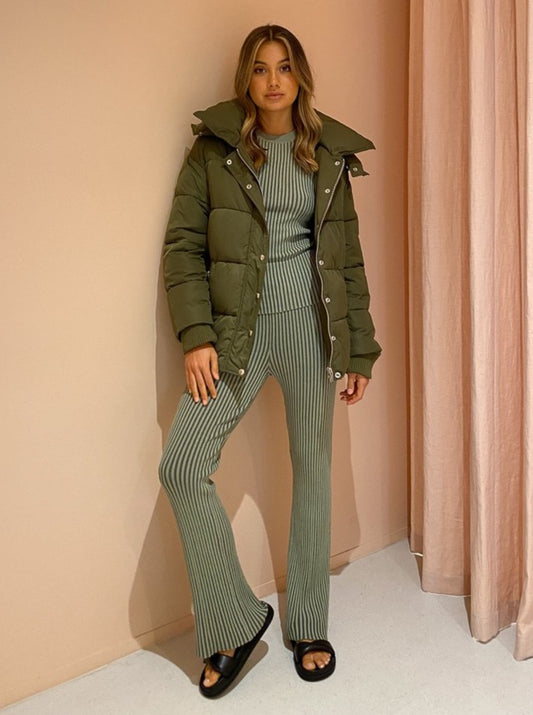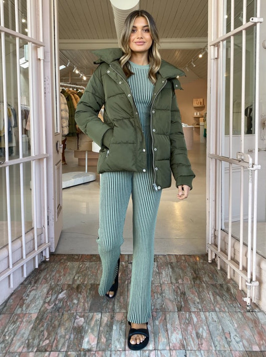 Coco Styling Tip: Match the Cropped Puffer back with the Ena Pelly Contrast knit Top in Tonal Sage and the Contrast knit pant in Tonal Sage for the ultimate off-duty look!