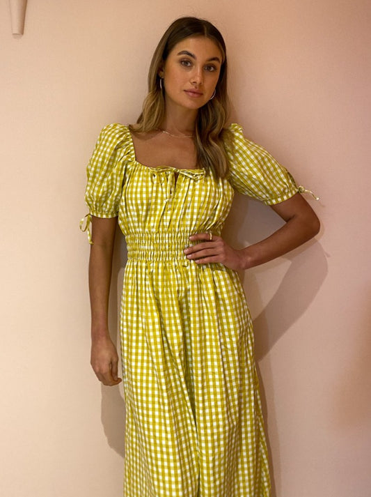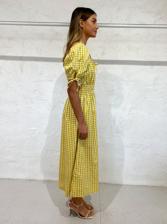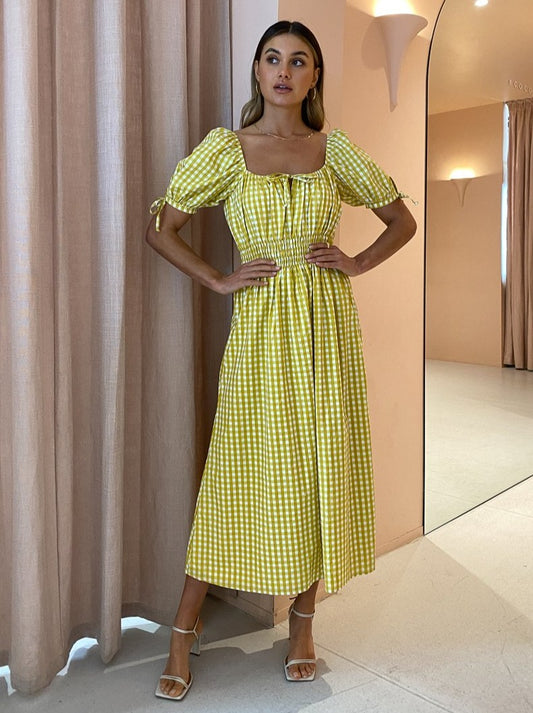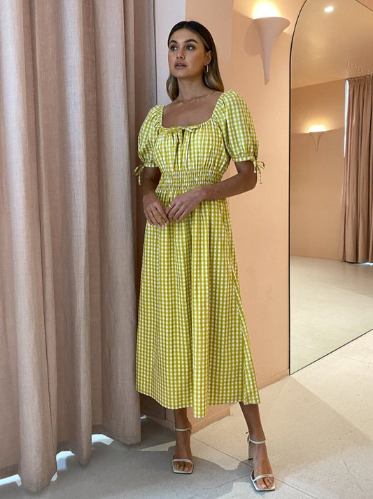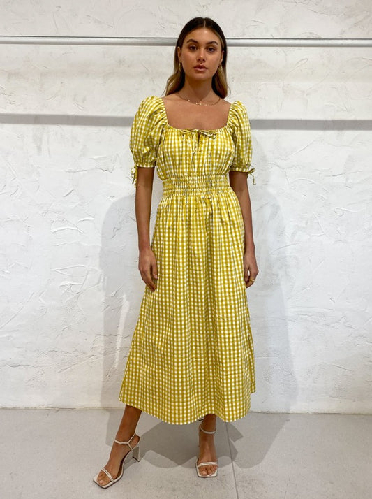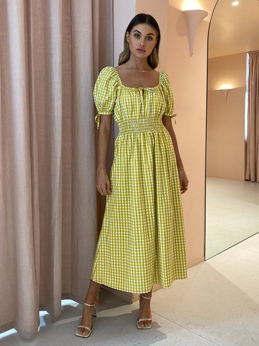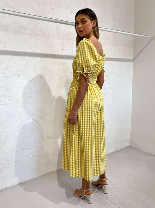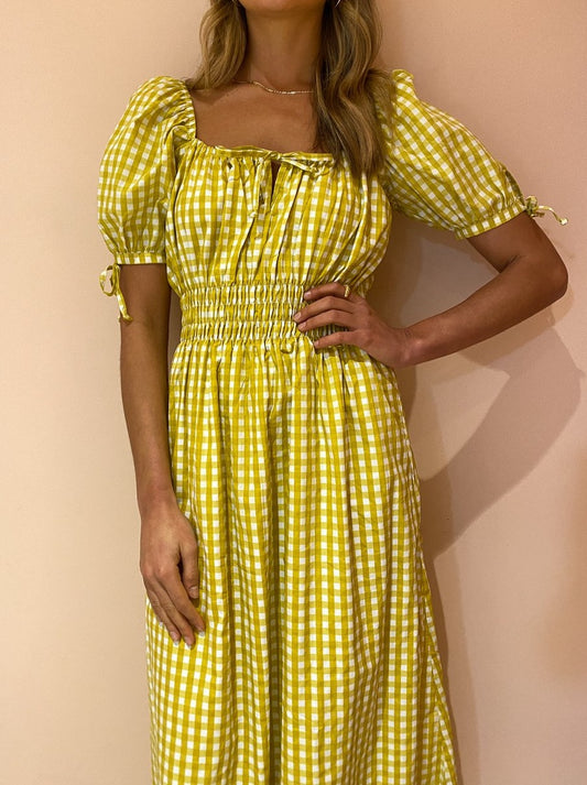 With the marigold check paired with sweet bow detailing and the right amount of volume in the sleeve and skirt, this midi dress is our go-to for wedding festivities through to long lunches.