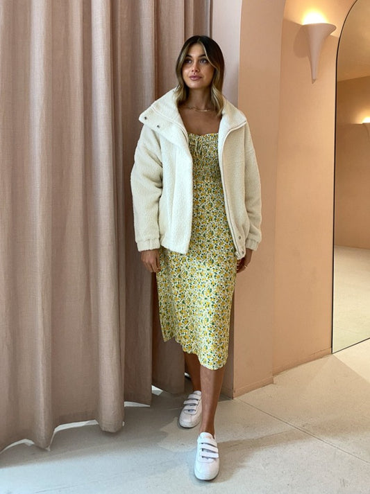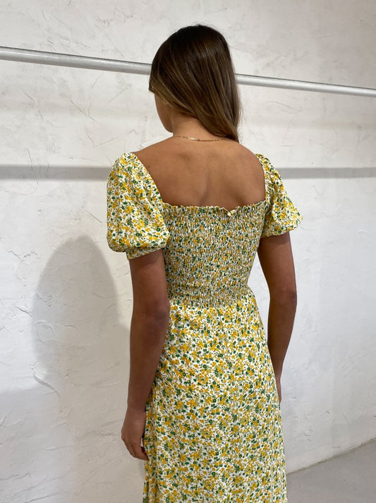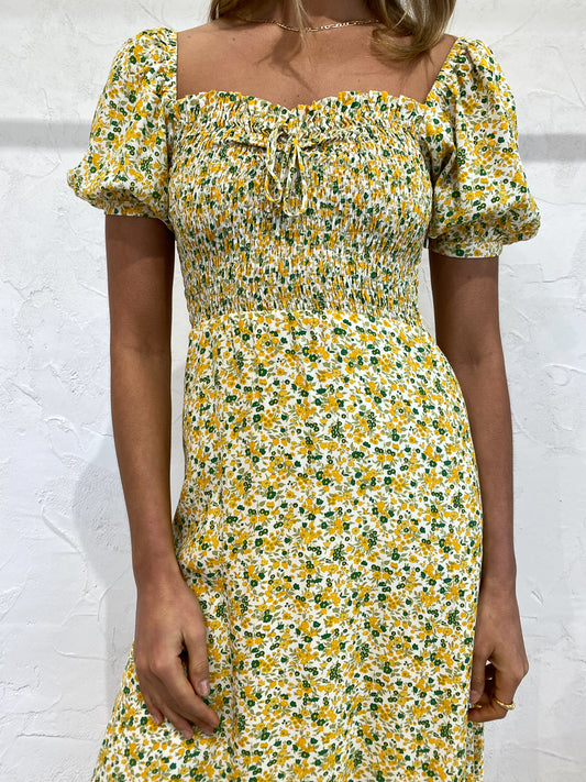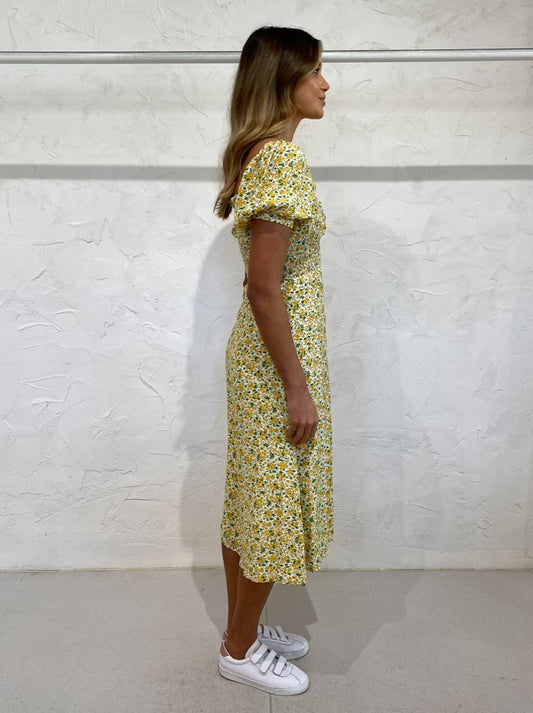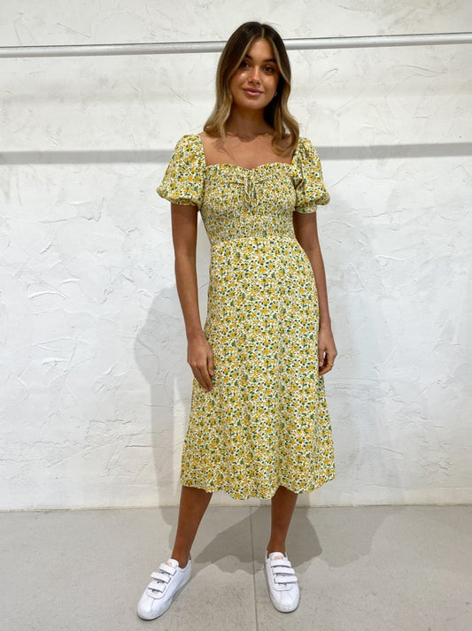 The Olympia Midi Dress in Rosemary Floral Print from Faithfull the Brand is the sweetest midi moment to freshen up your seasonless styling.