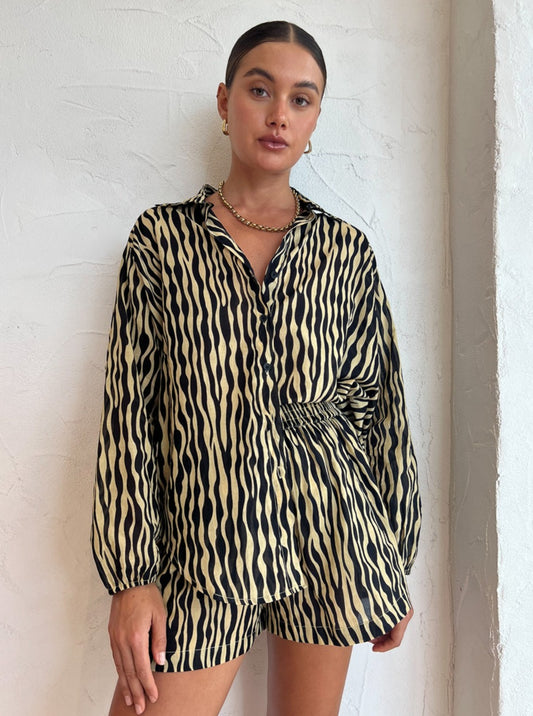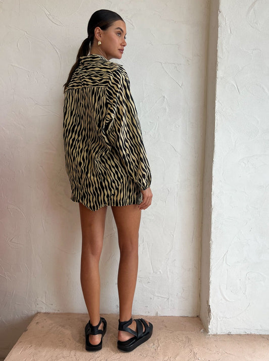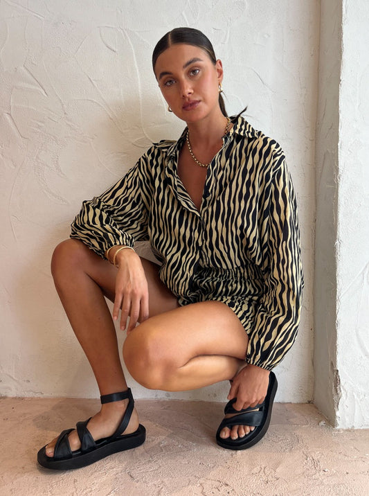 Complete the look with the Rylen Shirt in Capo Testa, Camilla and Marc Twister Flat Sandal in Black, Mali Ring Set in Gold, Brie Leon Large Uma Earrings in Gold, Porter Chunky Belcher Necklace 2.0 in Gold, Porter Triple Heirloom Ring in Gold, Dylan Bangle in Gold and the Dylan Celestial Bangle in Gold.