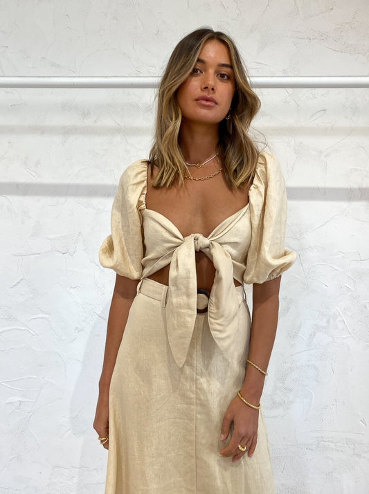 Crafted with 100% Linen, and featuring voluminous puff sleeves, plunging neckline and centre-front knot detail.