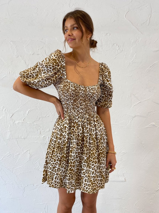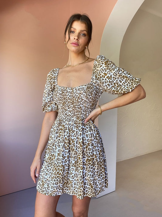 The animal print is complimented by a feminine shirred bodice, puffed sleeves and relaxed skirt.