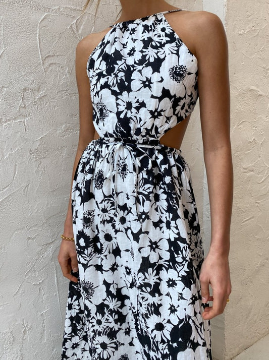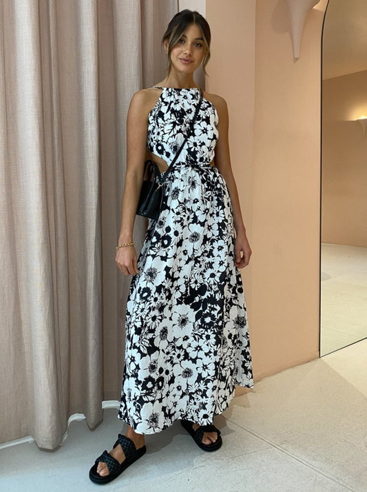 Designed to form and flatter with ease and comfort, this maxi dress is crafted from a Linen fabrication. Featuring a high neckline with halter straps, a floaty maxi length skirt and flattering waist cut outs to balance.