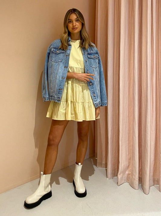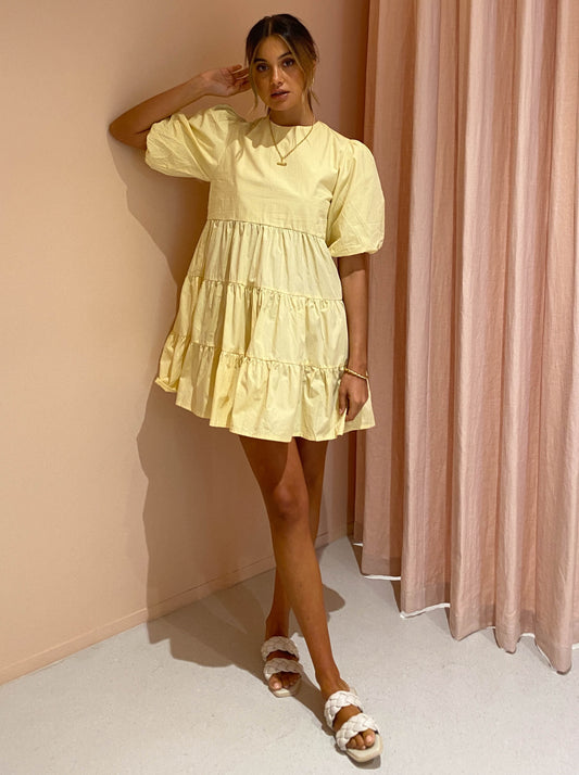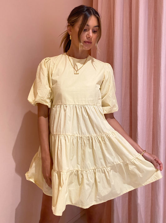 The Sade Mini Dress in Plain Banana from Faithfull the Brand is the sweetest shade of pastel yellow to add to your transeasonal wardrobe.