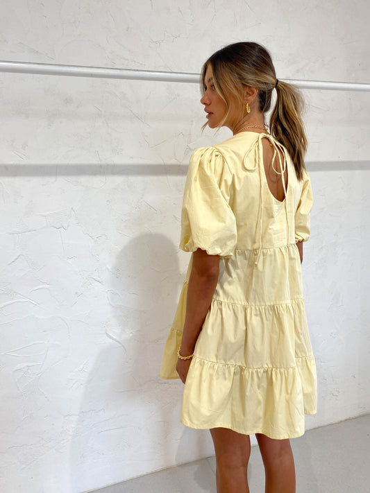 Featuring a smock style inspired silhouette, this mini dress features a soft round neckline, puff mid sleeves and, fitted bodice and a tiered mini dress, with an unexpected open back.