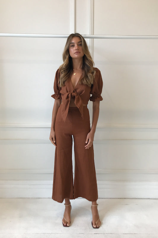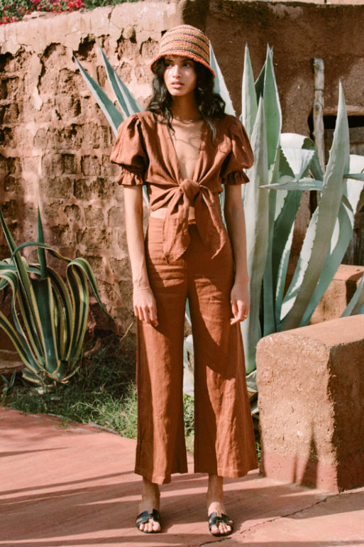 The Faithfull the Label 'Scelsi' pant in plain chestnut is the perfect pair of wide leg pants for this transeasonal weather. These look amazing with the Faithfull the Label 'Jamis' Wrap top in plain chestnut and a pair of our COCO x Superga white sneakers.