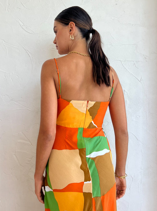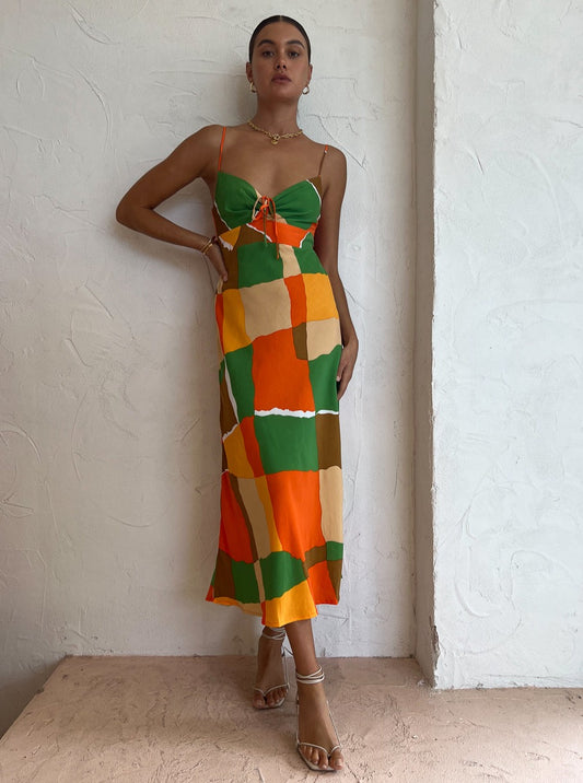 Coveted for its abstract retro-inspired print and easy-to-wear silhouette, this midi dress is the perfect addition for weekend getaways, holiday escapes and off-duty dressing.