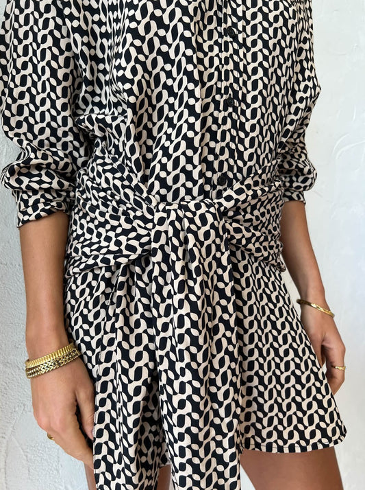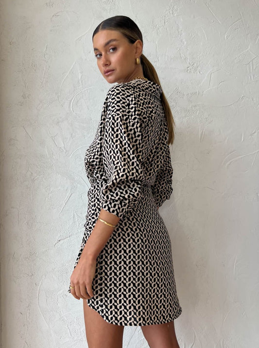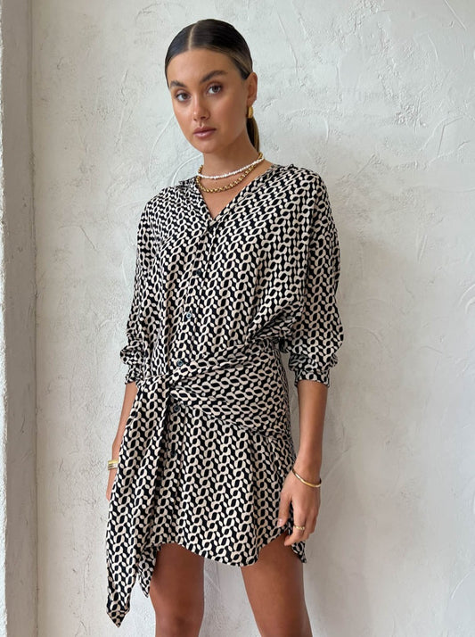 Crafted from a lightweight geometric printed fabrication, this shirtdress inspired silhouette sits oversized against the body. Featuring long cuffed sleeves, a V-neckline and button through front placket that falls into an A-line skirt.