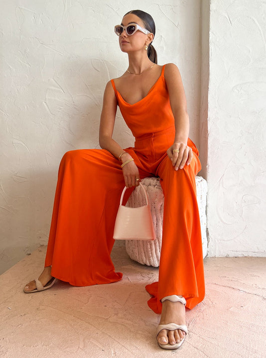 Complimented by its wide-leg silhouette and vibrant tangerine hue, Coco can't wait to integrate these pants into their desk-to-dusk wardrobe.