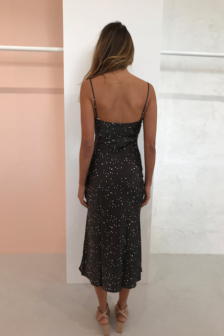 The GINIA Blaire Dress is the perfect piece to dress up or down. Designed from a lustrous silk satin in an elegant star print, the Blaire features a scooped neckline, fine adjustable shoulder straps and a range of colours to choose from. The slip is cut on the bias to mould beautifully to the body and finishes mid calf.