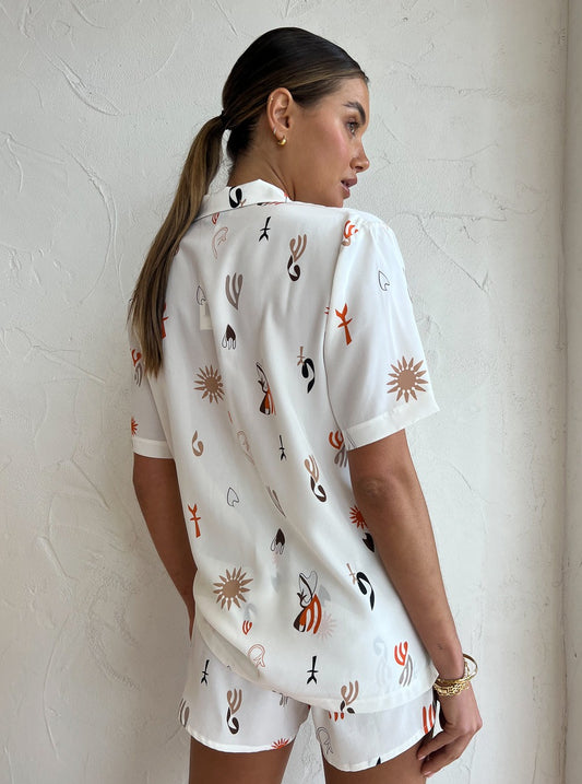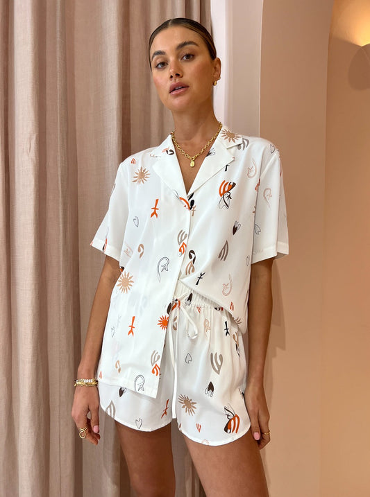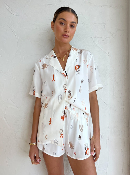 Detailed with abstract motifs, this silk satin short sleeve shirt sits relaxed on the body. Featuring a dropped collar, embossed mother of pearl buttons and a front chest pocket.
