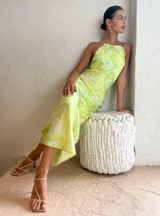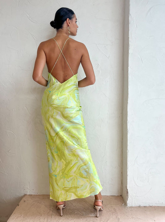 Introducing the alluring Ginia Gaia Maxi Dress in Lime Swirl Print.