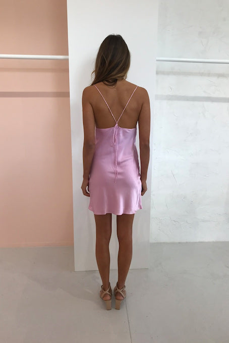 Delicately crafted from a lustrous silk satin and cut on the bias to mould to the body – the GINIA Georgia dress is a mini length silk dress featuring fine adjustable straps and a cowl neckline with lace up back.