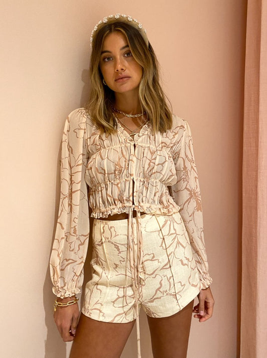Designed in a tonal pink hibiscus floral print, this draped blouse features delicate gathered panels throughout synched in with a waist tie and elasticated cuffs.